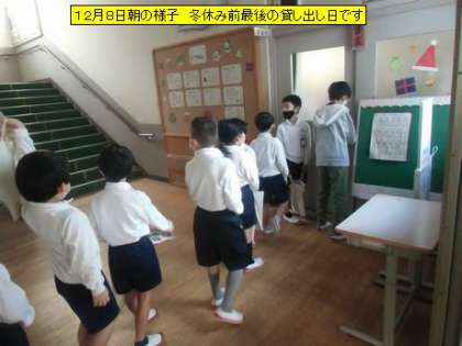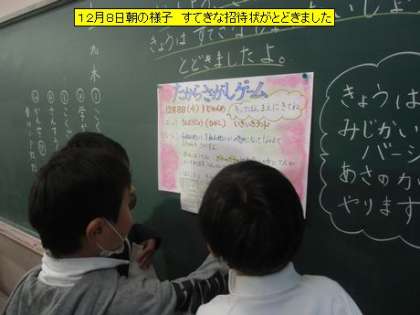 教室を回ると、図書室前に行列ができていました。今日が冬休み前の最後の貸し出し日だそうです。1年生の教室に素敵な招待状が届いていました。6年生と1年生がペアになって「たからさがしゲーム」をするようです。きっと楽しい時間になると思います。