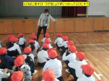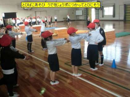 1年1組の皆さんが、体育館で「とびばこあそび」をしていました。物を跳びこす動きは日ごろの生活の中にはあまりありません。どんなふうに跳びこしたらいいのか、子どもたちは考えながら、跳び箱の上に跳びのっていました。腕を上手に使って跳びこす子がいました。