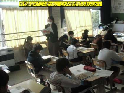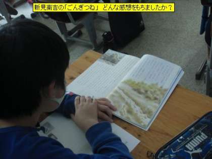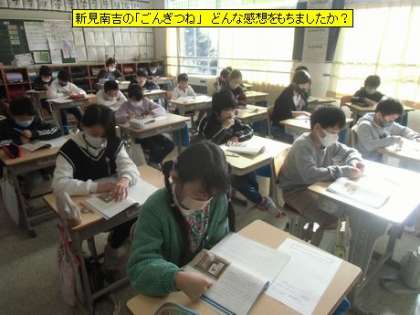 4年3組の国語は、新見南吉の「ごんぎつね」の学習に入るところでした。今日は、担任の先生の範読の後、最初の感想をもちました。初めて読むこの物語に子どもたちはどんな感想をもったのでしょう。新見南吉という作者について知るのも、この物語を理解することにつながると思います。