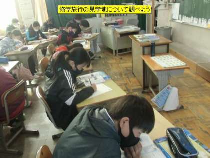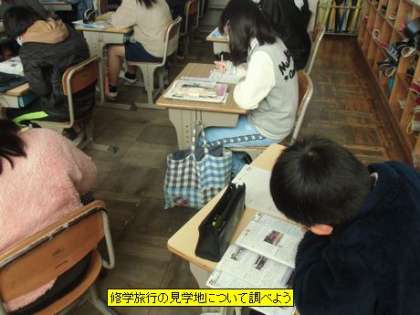 修学旅行も、いよいよ来週に迫ってきました。6年3組では、修学旅行で行く見学地についての一人調べを、集中して行っていました。修学旅行では、「法隆寺」「東大寺」「二条城」「金閣寺」などに行く予定です。見てきたいものを自分の目でしっかりと見てきてください。