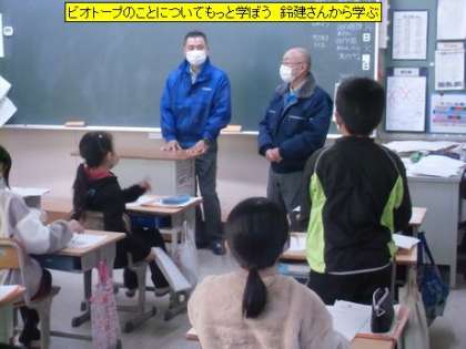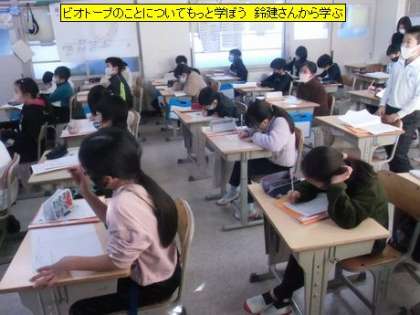 今日は、4年生の各クラスに鈴建の日高さん、川合さんに入っていただき、子どもたちがもっている疑問に答えていただきました。「ビオトープの土はどんな土がいいのか」「外来種を取り除くにはどうしたらいいか」「子どもができるビオトープの管理の仕方は」などたくさんの質問が出ていました。質問の内容から「自分たちのビオトープ」と意識を強くもち始めていることが分かりました。