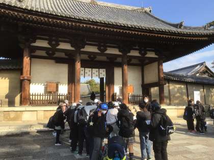 法隆寺に到着しました。南大門前でガイドさんの説明を聞いています。