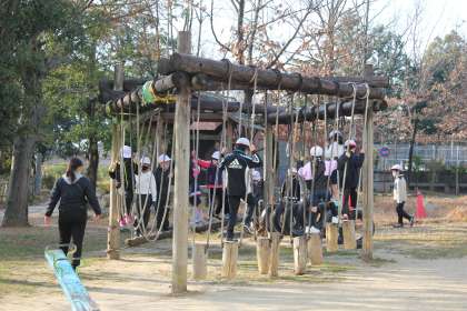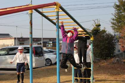 運動場で体育をする前ウォーミングアップをしていました。遊具で楽しく活動できていました。