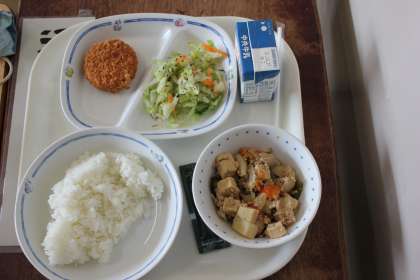 今日のメニューは、和風コロッケ・青菜あえ・海苔の佃煮・ご飯・高野豆腐のうま煮・牛乳でした。おいしくいただきました。