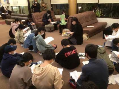各部屋の部屋長がロビーに集まりました。日程の確認と体調の確認をしました。この後、入館式、夕食、伝統工芸体験を行う予定です。