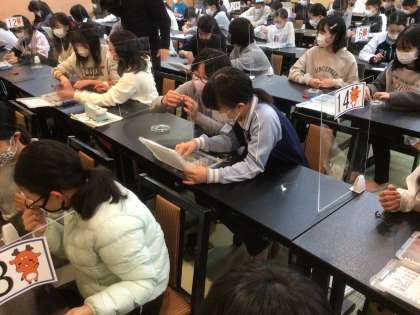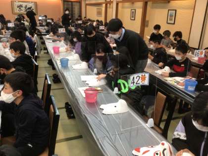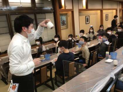 伝統工芸体験が始まりました。清水焼の絵付け、念珠づくり、キツネの面の3つから一つを選び、作業に入ります。記念に残る一品を一生懸命に作っています。