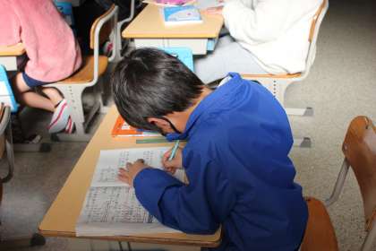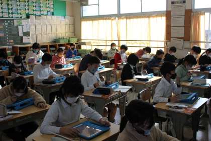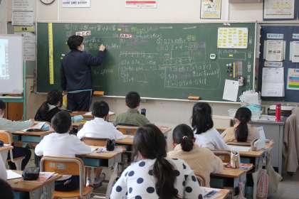 小数に整数をかける問題のまとめをしていました。黒板の大切なポイントを加えながら、ノートにまとめていました。タブレットに送られた練習問題を解いて、定着を図っていました。