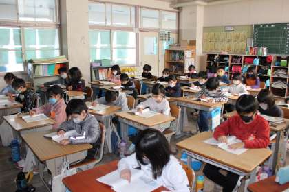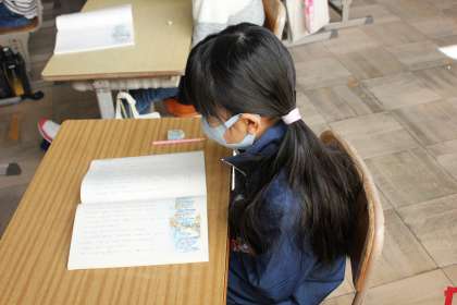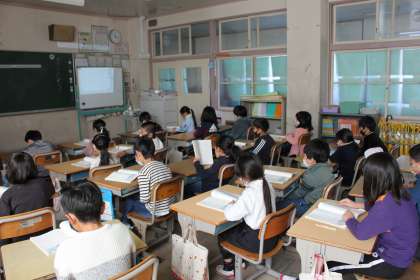「かさこじぞう」のお話をデジタル教科書の音声から聞いていました。指読みしながら、どんなお話か読むことができました。