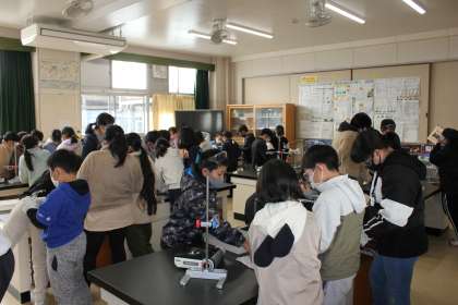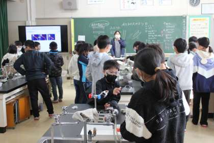 「水のあたたまり方」の実験を理科室で行っていました。火をつけたところから、水がどのように温まっていくのか確かめていました。安全に気を付けて行うこともできていました。