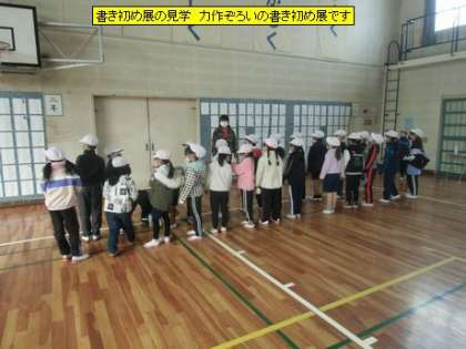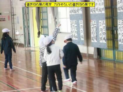 2年3組の皆さんが、体育館で行われている書き初め展の見学に来ていました。全校の作品が揃っている中から通学班の班長さんの作品を探したり、お兄さん・お姉さんの作品をじっくりと眺めていました。「みんなじょうずだな」と感想を話しているのが印象的でした。