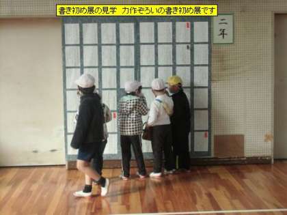 書き初め展の見学 力作ぞろいの書き初め展です(2年3組)