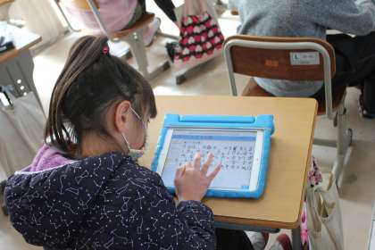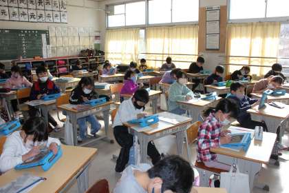 分数のひき算をどのようにするのか話し合いをしていました。タブレットに大切なことをまとめたり、問題を解いたりしていました。