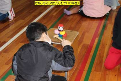 今日は、1年生の皆さんが体育館で「むかしあそびをたのしむかい」を行っています。おじいさんやおばあさんはいませんが、担任の先生や学年の先生、学校の先生に教わったり、中には自分でどんどんやれる子もいて、昔遊びを楽しんでいます。けんだま、かるた、めんこ、おはじきなどいろいろな昔遊びを順番に行っていきます。