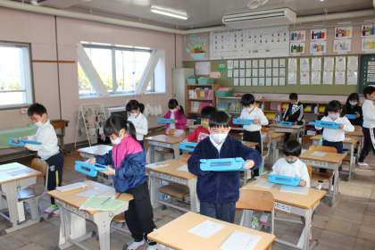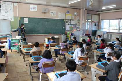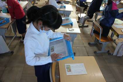 昔話を読んで友達に紹介する作品をタブレットで撮影していました。先生の説明を聞いてから、上手に撮影しようとがんばっていました。