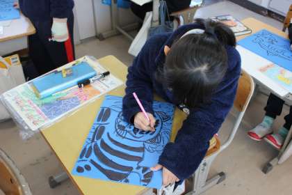 「スチレン版画」の版を鉛筆で削っていました。細かく丁寧作業していました。