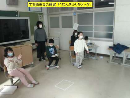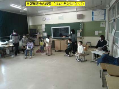 学習発表会の練習「1ねんをふりかえって」(6・7・8組)