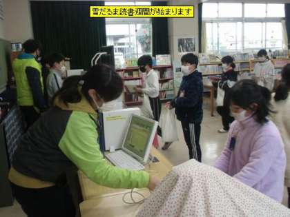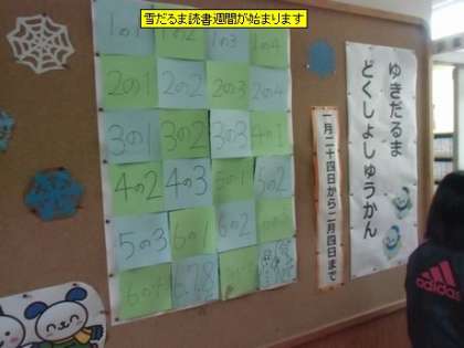 今日から2月4日までの間、雪だるま読書週間が行われます。各学年の目標は、低学年=4冊以上、中学年=150ページ以上、高学年=200ページ以上です。読破賞めざしてがんばってください。その他、図書委員会の楽しい企画もあるようですのでお楽しみに。