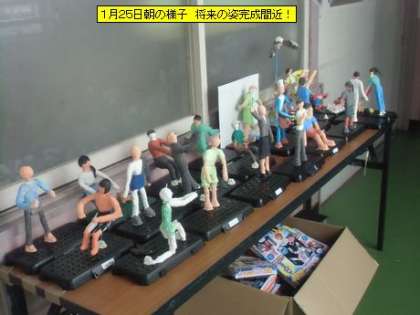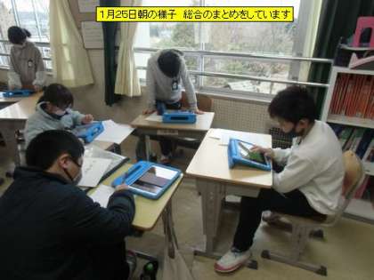 教室を回ると、6年生の廊下には「将来の姿像」の力作が並んでいました。完成間近です。素直な子どもたちの気持ちが伝わってきます。6・7・8組さんは朝の体操が終わったところでした。使ったマットをみんなで協力して片付けていました。4年生は、総合のまとめでパワーポイントのスライドを作成中です。みんな真剣な様子です。