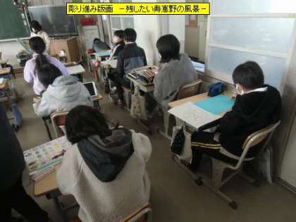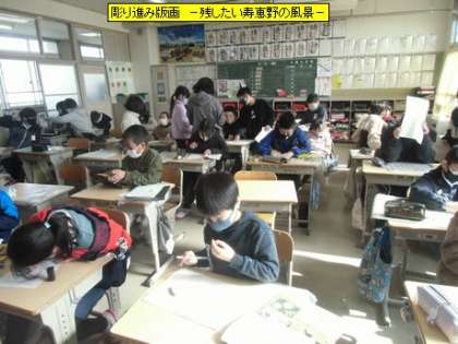 図工 彫り進み版画 −残したい寿恵野の風景−(5年3組)