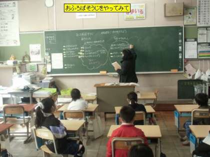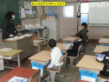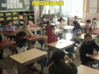 1年2組の道徳は、「おふろばそうじ」についてみんなで考えていました。自分の経験から、おふろ場そうじをしてほめられてうれしかったことやきれいになったおふろ場を見て、そうじが楽しくなったことを発表していました。がんばってやってよかったという気持ちをもち始めていることが分かりました。