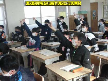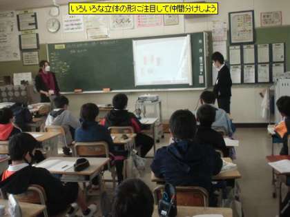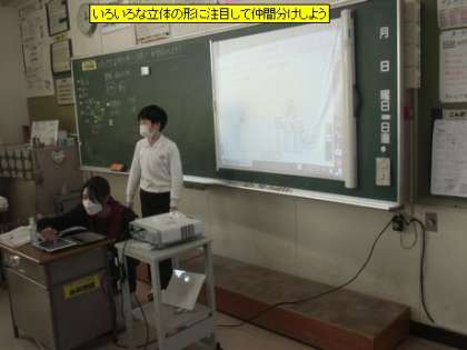 5年1組の算数は、立体の学習です。今日は、スクリーンに映っている5つの立体を仲間分けする学習です。立体の共通する部分とそうでない部分を探しながら仲間分けした後、その考えをみんなで確かめ合いました。「なるほど」「そう、そう」などの反応がいっぱい聞かれました。