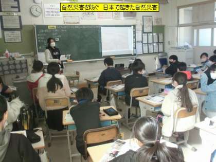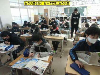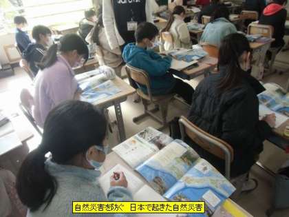 5年1組の皆さんが、日本で起きた自然災害について調べていました。11年前に起きた東日本大震災の時の様子は教科書にものり、子どもたちもその被害の大きさは知識としてもっていました。他にも、日本は多くの地震や津波、台風などの自然災害が起きている国であることを知っておくことは大事なことです。そして、その自然災害についての備えについて学習してもらいたいと思います。