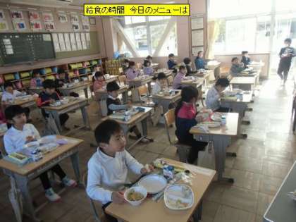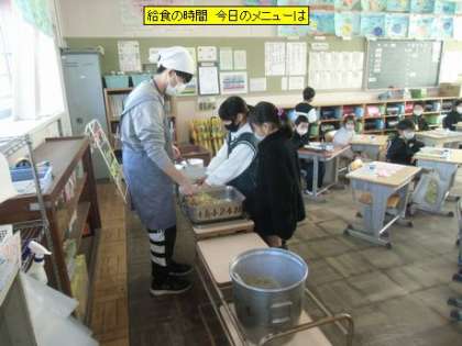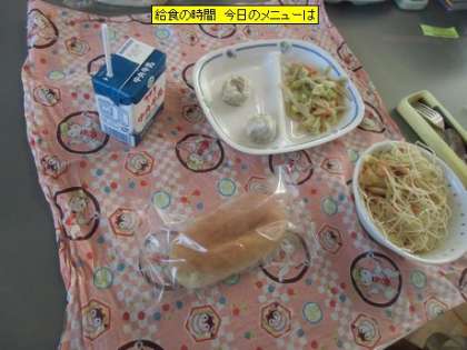 給食の時間が始まりました。今日のメニューは、いためビーフンとシュウマイです。残さずおいしく食べてください。