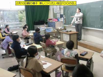 教室を回ると、いつもの様子が見られます。朝の会でスピーチをしたり、先生の話を聞いたり。3年生では、明日の「健康記念日」にちなんで、新しく作りたい祝日「〇〇の日」をみんなで考えていました。とても楽しそうでした。