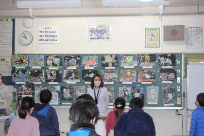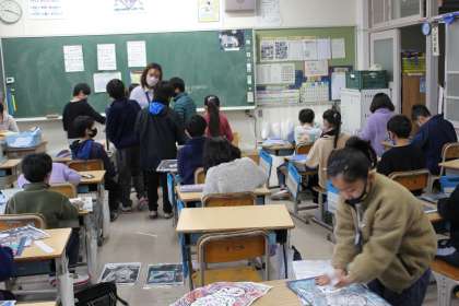 スチレン版画の作品を台紙に貼って、完成させていました。素敵な作品がたくさん並んでいました。