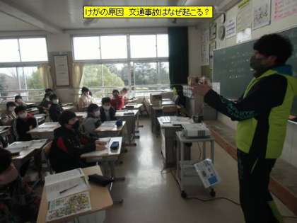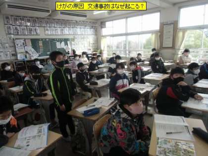 5年1組の保健の学習の内容は、「けがが起きる原因」についてみんなで考えていました。子どもたちのけがの経験から、その原因を探ると、「人の行動」「周りの環境」によってけがが起きていることが分かりました。交通事故においても同じことが言えそうです。原因となることを取り除けば、けがも交通事故もなくなるはずです。