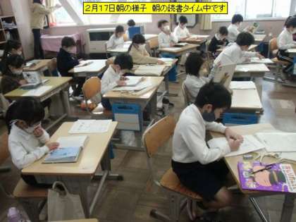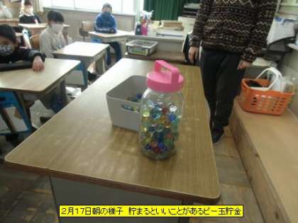 読書タイム中の1年生の教室では、借りた本を読み、読書カードにタイトルなどを記録していました。今年は、何冊の本を読んだのかな。2年生の教室では、ビー玉貯金のビンをみんなで見ていました。ビー玉が貯まると何かいいことがあるそうです。早く貯まりますように。今日も、1日がスタートしました。