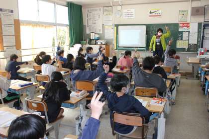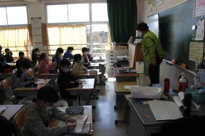 等しい分数にはどんなものがあるのか、考えていました。数直線を使い、縦に線を引いて同じ位置の分数が等しい分数だと分かりました。