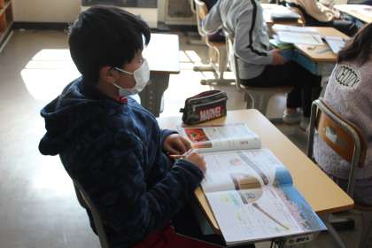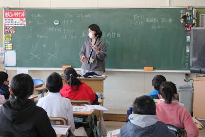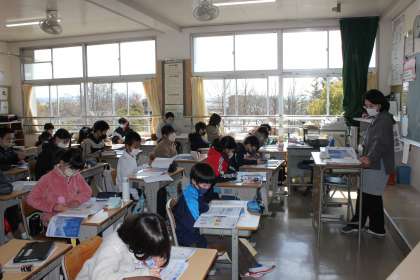 「春の海」の鑑賞をしていました。実際に、尺八を見て、音色を聞くことができました。