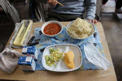 黙食していますが、ポーズを取ってもらいました。おいしくいただくことができました。本日のメニューは、コーンサラダ・オムレツ・ソフトめん・ミートソース・牛乳・コーヒー牛乳のもとです。