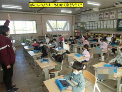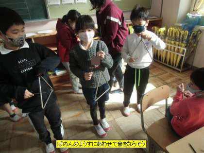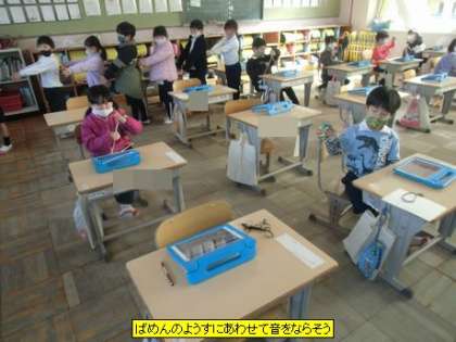 音楽 ばめんのようすにあわせて音をならそう(1年4組)