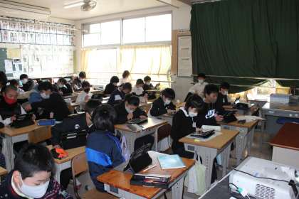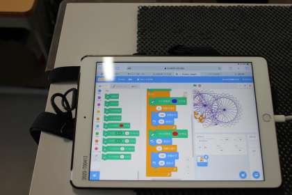 スクラッチのアプリを使い、多角形を描く学習をしていました。いろいろな指示を入力して自分の描きたい図形をプログラミングしていました。