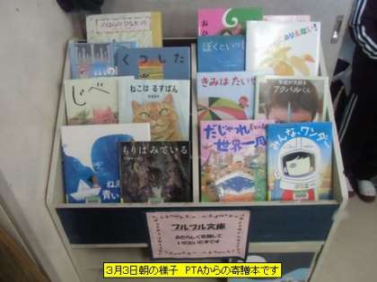図書室に行くと、PTAからの寄贈本が紹介されていました。今年も、20冊の絵本をいただきました。ありがとうございました。子どもたちに紹介し、たくさん読んでもらいたいと思います。今日は、下校時に、子どもたちの登下校を見守っていただいている見守り隊の方々、交通指導員さんに感謝の気持ちを伝える「感謝の会」を行います。しっかりと気持ちを伝える時間にしたいと思います。今日も、1日がスタートしました。