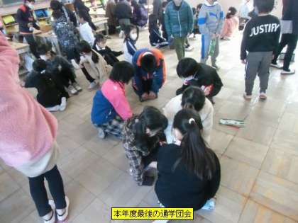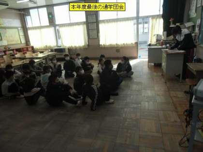 今日の5時間目は、本年度最後の通学団会です。1年間の登下校の反省をしたり、交通ルール等の確認をしました。また、来年度に向けた準備も行いました。新しい班長さんや新1年生を入れた並び方などを決め、確認しました。交通事故が起きないことをいつも願っています。