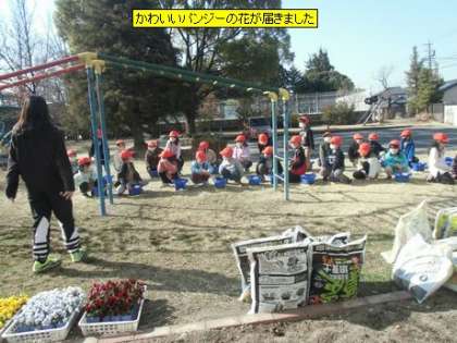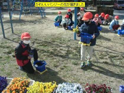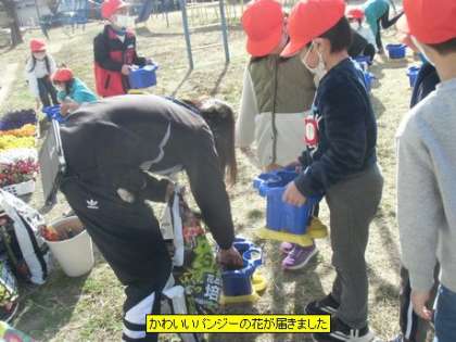 かわいいパンジーの花が届き、今日は1年生の子のプランターに植えます。色鮮やかな花が春を感じます。このパンジーの花は、卒業式の日に会場周辺に置かれ、卒業生の門出を祝います。