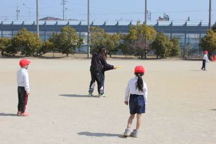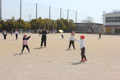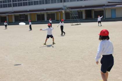 アルティメットのフリスビーを投げる練習をしていました。なかなかこつをつかむのが、難しそうでした。練習していくうちに、遠くへ飛ばせる子が増えてきました。