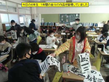 6年3組に行くと、1年間で作った習字や図工の作品、作文などを整理していました。整理しながら、友達と今年をなつかしく振り返っていました。4組は、寄せ書きづくりで大忙しです。こういう時間もあと2日しかありません。