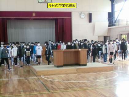 6年生の皆さんが、別れの言葉の練習をしているところでした。一つ一つの言葉をかみしめながら言っている様子が伝わってきます。体育館では、学級旗が6年生の様子を見守っていました。