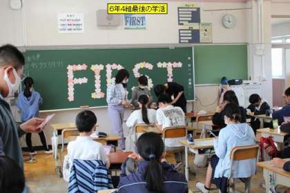 6年4組に行くと、級訓「FIRST」が桜の花びらで形作られていました。メッセージが書かれたこの花びらの前で、最後の学活を行っていました。