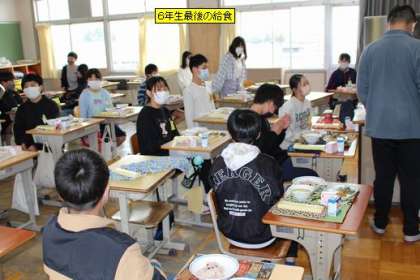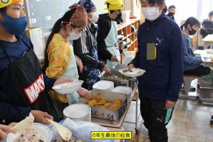 小学校生活最後の給食です。配膳も、手慣れたものです。