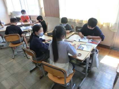 左の写真は、4年2組のグループ学習の様子です。グループみんなで1つのことに真剣に取り組んでいる様子がわかります。