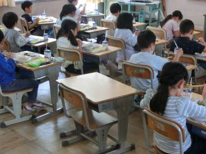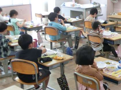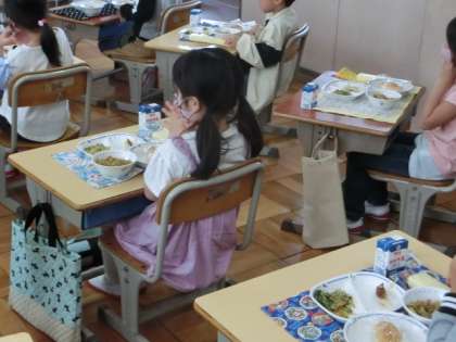1年生は、寿恵野小学校で食べる初めての給食でした。メニューは、焼きそば、米粉パン、ナムル、餃子、牛乳です。ただし、「黙食」はルールです。みんな、しっかりルールを守っていました。