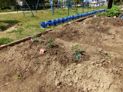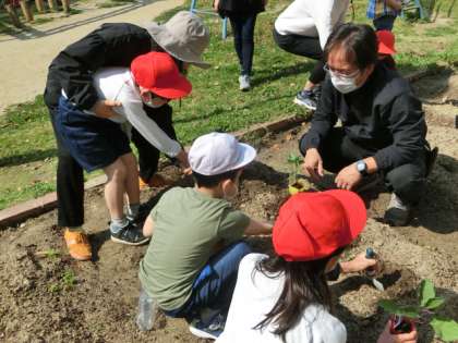 これらの苗は、前日にみんなで買いに行ったものです。なす・トマトなどなど…、一人一人が植えたいと考えた夏野菜を植えました。しっかりお世話をして、立派な実を収穫してほしいと思います。