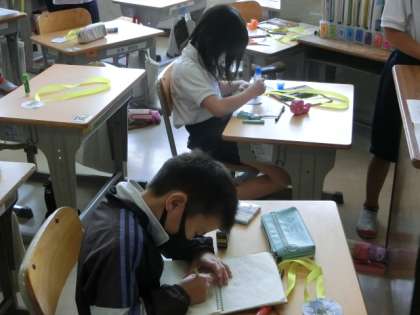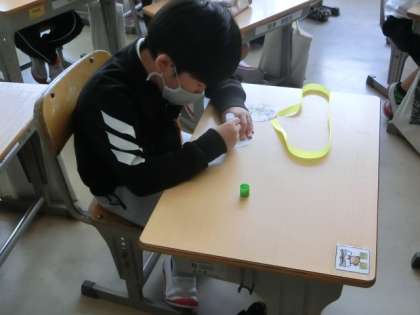 3年生は、新入生へのプレゼント、どじょりん(ビオトープのマスコットキャラクター)のメダルを作っていました。もらって嬉しいものとなるように、一生懸命作っていました。
