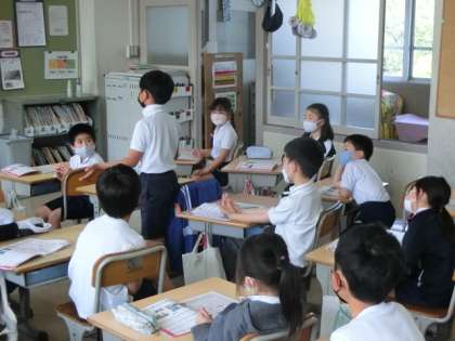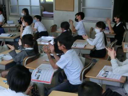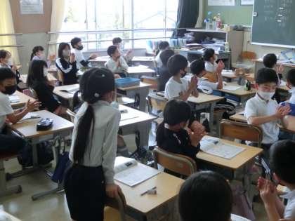 3年生の音楽「リズムを知ろう」学習の様子です。4分の4拍子のリズムについて、みんなで手をたたきながら確認しています。