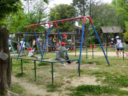 いきいきランドでは、たくさんの子どもたちが遊具で遊んでいました。とても楽しそうでした。なお、本校では、いきいきランド・北運動場・東運動場を、放課(休み時間)ごとに、2学年ずつに振り分けて、使用できるようにしています。今日の長放課のいきいきランドは1年生と6年生が割り当てでした。
